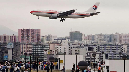 雖然啟德機場曾經(jīng)是世界上最繁華的機場之一,但也是全球飛行員所公認的、起降難度最高的機場之一。香港在八十年代迎來了高速發(fā)展的黃金時期,拔地而起的高層建筑構成了密密麻麻的鋼筋水泥森林,并且一直延伸到啟德機場的跑道附近。而在飛機旅客的視角來看,在飛機飛入啟德機場時,旅客幾乎要與屋頂?shù)碾娋、晾衣繩來個親密接觸,舷窗外便是清晰可見的樓房、行人和車輛。假如運氣夠好,你甚至能夠透過樓房的窗戶,觀看到香港居民樓內(nèi)電視正在播放的內(nèi)容!這座繁華與危險并存的機場,也在國內(nèi)航空史上留下了濃墨重彩的一筆。