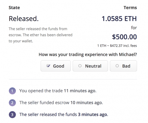 當交易者創建訂單后,兩方之間便建立了交易。當交易者輸入他們想要購買或出售的以太幣數量,該訂單的匯率被鎖定在交易中。