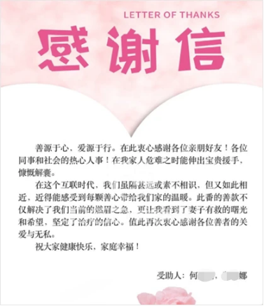 對此,何先生再次表示感謝。“360大病籌的這筆善款幫我頂過了最艱難的時刻,很多人都覺得,這么艱難的情況下,我能堅持下來是一件很不可思議的事情,其實也和這些幫助我們的人有很大關系。”他還專門寫了一封感謝信發到平臺上,真摯地感謝著每一位愛心人士,因為對這個艱難前行的男人而言,愛心網友的每一筆捐款,都是妻子活下來的希望,“那些幫助過我們的人,我每一位都記得。”
