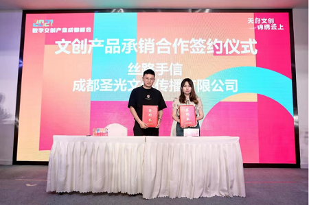 同時,敦煌博物館文創IP——絲路手信主理人繆孟橋先生與成都圣光文化傳播有限公司,簽訂了《文創產品承銷合作書》,據了解本次合作雙方將達成2000萬文創產品的承銷意向,將在之后為各位呈現更加具有創意與設計感的文創產品。