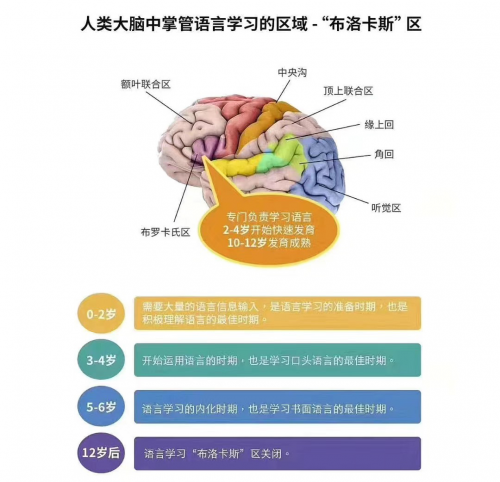 除了時間優勢外,還有發育優勢,這個年齡段口腔肌肉和大腦都是發育的關鍵期。在人類大腦中,掌管語言學習的區域叫做“布洛卡斯”區。在孩子0-6歲的時候快速發育,可以同時吸收和分辨多種語言,這個階段也就是我們說的“關鍵期”。