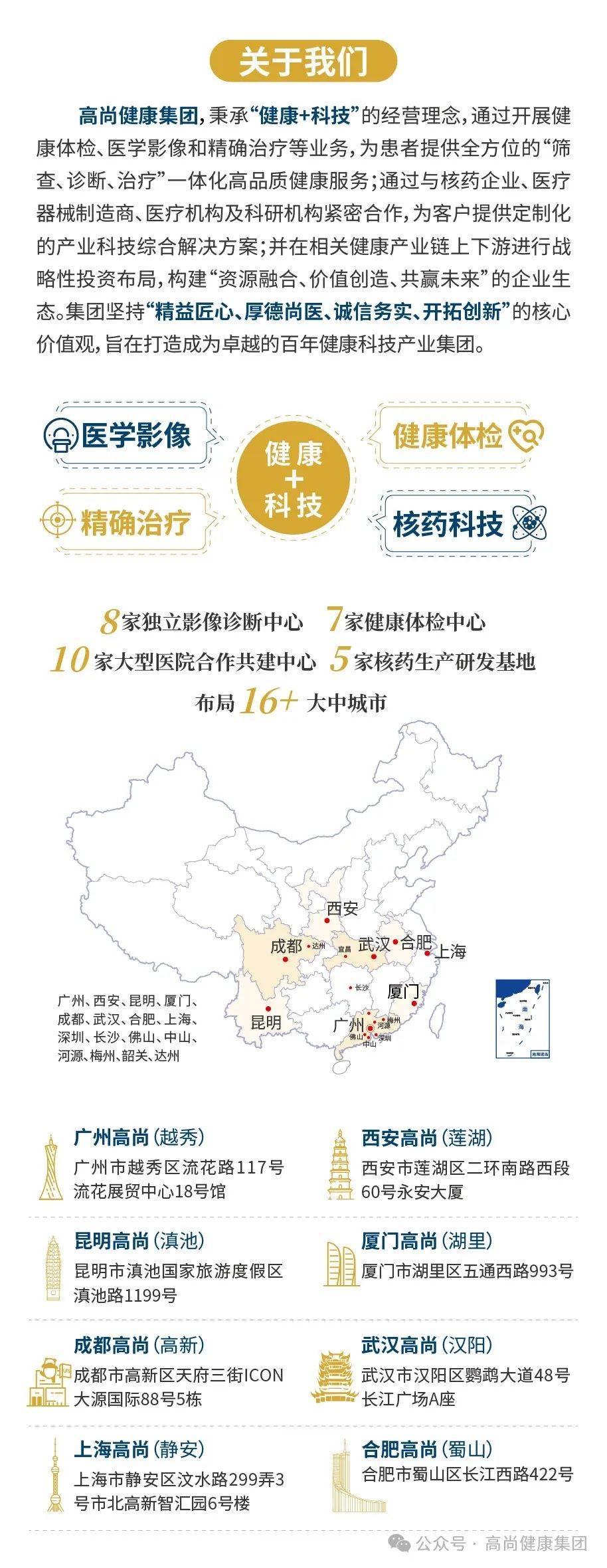 高尚健康集團成立于2003年,是一家在核醫(yī)學及第三方影像診斷領(lǐng)域具有廣泛影響力的醫(yī)療產(chǎn)業(yè)集團。在國內(nèi)PET/CT起步之初,高尚健康集團便與多家大型醫(yī)院共建PET/CT中心,成為國內(nèi)早期開展PET/CT技術(shù)的企業(yè)之一。高尚健康集團秉承“健康+科技”的經(jīng)營理念,通過開展健康體檢、醫(yī)學影像和放射治療等業(yè)務(wù),為患者提供全方位的“篩查、診斷、治療”一體化高品質(zhì)健康服務(wù);通過與核藥企業(yè)、醫(yī)療器械制造商、醫(yī)療機構(gòu)及科研機構(gòu)緊密合作,為客戶提供定制化的產(chǎn)業(yè)科技綜合解決方案;在相關(guān)健康產(chǎn)業(yè)鏈上下游進行戰(zhàn)略性投資布局,構(gòu)建“資源融合、價值創(chuàng)造、共贏未來”的企業(yè)生態(tài)。目前已經(jīng)建立8家獨立影像診斷中心、7家健康體檢中心、10家大型醫(yī)院合作共建中心、5家核藥生產(chǎn)研發(fā)基地,帶著“深耕”精神,布局16+大中城市,積極推動國家分級診療發(fā)展。
