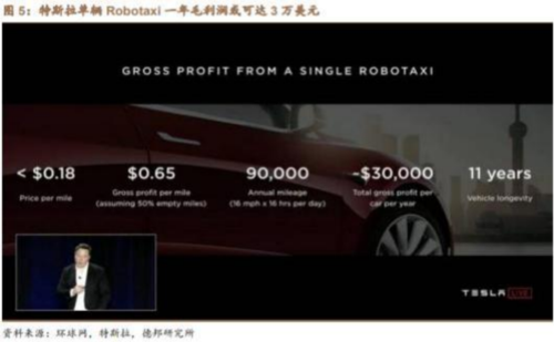 根據(jù)特斯拉官網(wǎng),大部分車主每天的車輛使用率只有5%至 10%,全自動(dòng)駕駛車輛的基本經(jīng)濟(jì)效用,將很可能是非自動(dòng)駕駛汽車的數(shù)倍。據(jù)馬斯克,一輛 Robotaxi 行駛每英里的成本或?qū)⒌陀?0.18 美元,Uber 和 Lyft 的傳統(tǒng)拼車服務(wù)的平均成本為每英里 1- 2 美元,特斯拉 Robotaxi 每年潛在的毛利潤(rùn)大概在 3 萬(wàn)美元左右。