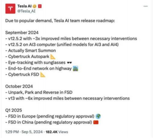 9月5日,特斯拉人工智能團(tuán)隊(duì)在社交平臺(tái)發(fā)布消息稱,預(yù)計(jì) 2025 年第一季度在中國(guó)和歐洲推出完全自動(dòng)駕駛 FSD 系統(tǒng),但仍有待監(jiān)管批準(zhǔn)。