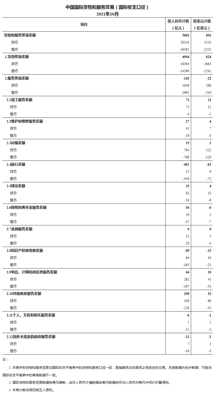 國家外匯管理局公布2021年10月我國國際貨物和服務貿易數據