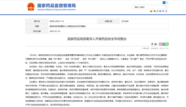 核心提示:據國家藥監局官網消息,1月24日,國家藥監局在2022年全國藥品監督管理暨黨風廉政建設工作會議上部署深入開展藥品安全專項整治行動。 會議指出,藥品(含醫療器械、化妝品)安據國家藥監局官網消息,1月24日,國家藥監局在2022年全國藥品監督管理暨黨風廉政建設工作會議上部署深入開展藥品安全專項整治行動。