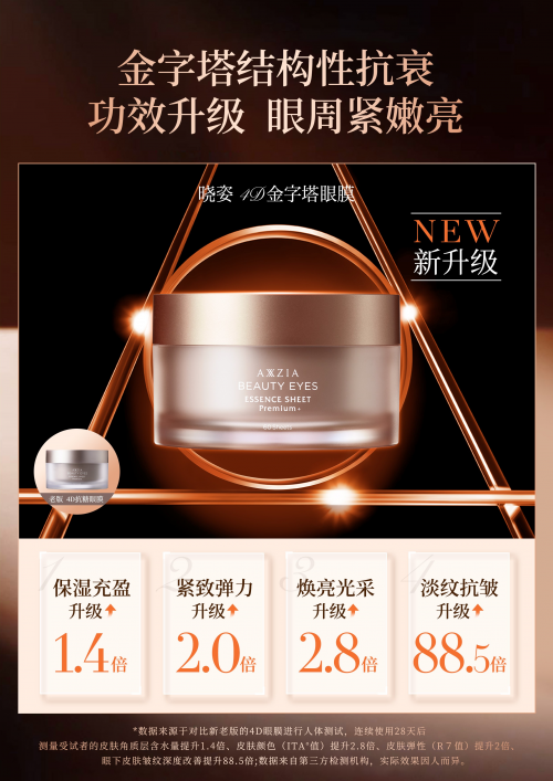 AXXZIA曉姿深挖眼周衰老誘因,將沙龍護(hù)膚科技投入到眼部家居護(hù)理產(chǎn)品中,提出眼部結(jié)構(gòu)性抗衰的突破性抗老理念,針對眼周衰老問題由表及里構(gòu)建抗衰金字塔,四層層層阻擊,4D立體守護(hù)。不僅補(bǔ)水煥亮淡化黑眼圈,更能改善眼紋、松弛、下垂等眼周結(jié)構(gòu)性衰老問題,多維實(shí)現(xiàn)眼周逆齡效果。