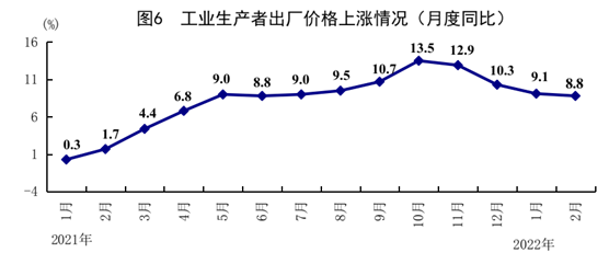 1—2月份,全國工業生產者出廠價格同比上漲8.9%。分月看,1、2月份全國工業生產者出廠價格同比分別上漲9.1%和8.8%,環比分別為下降0.2%和上漲0.5%。1—2月份,工業生產者購進價格同比上漲11.6%。