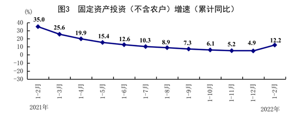 1—2月份,全國固定資產投資(不含農戶)50763億元,同比增長12.2%,比2021年加快7.3個百分點,比2021年兩年平均增速加快8.3個百分點。分領域看,基礎設施投資同比增長8.1%,制造業投資增長20.9%,房地產開發投資增長3.7%。全國商品房銷售面積15703萬平方米,同比下降9.6%;商品房銷售額15459億元,下降19.3%。分產業看,第一產業投資同比增長8.8%,第二產業投資增長19.6%,第三產業投資增長9.5%。民間投資增長11.4%。高技術產業投資增長34.4%,其中高技術制造業和高技術服務業投資分別增長42.7%、16.0%。高技術制造業中,電子及通信設備制造業、醫療儀器設備及儀器儀表制造業投資分別增長50.3%、41.2%;高技術服務業中,信息服務業、研發設計服務業投資分別增長26.3%、22.4%。社會領域投資增長19.1%,其中衛生、教育投資分別增長29.3%、19.8%。從環比看,2月份固定資產投資比上月增長0.66%。