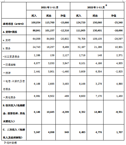 表一:2022年1-11月羅國際收支平衡表(經(jīng)常項目)