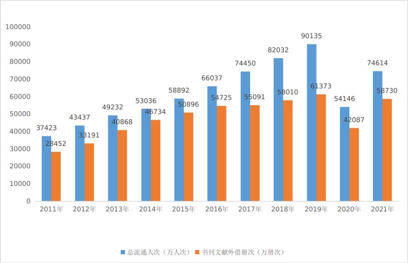圖2:2011-2021年全國公共圖書館總流通人次及書刊外借冊次