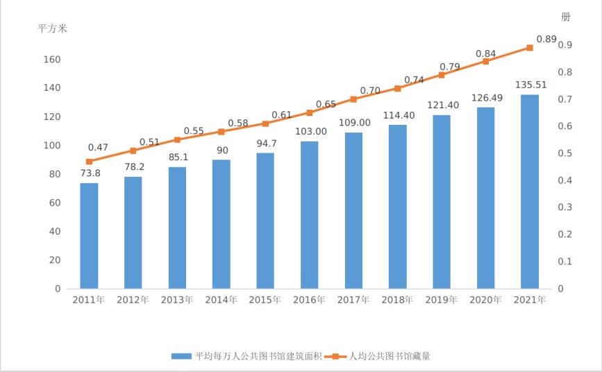 2021年末,全國平均每萬人公共圖書館建筑面積135.51平方米,比上年末增加9.05平方米,全國人均圖書藏量0.89冊,增加0.05冊;全年全國人均購書費1.57元,減少0.03元。