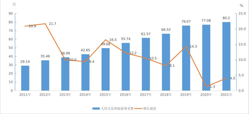 圖7:2011-2021年全國人均文化和旅游事業(yè)費及增速情況