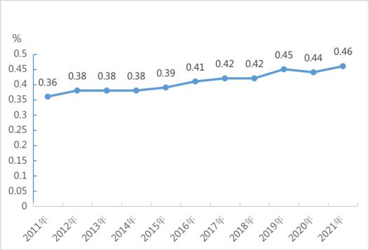 圖8:2011-2021年全國文化和旅游事業(yè)費占財政總支出比重