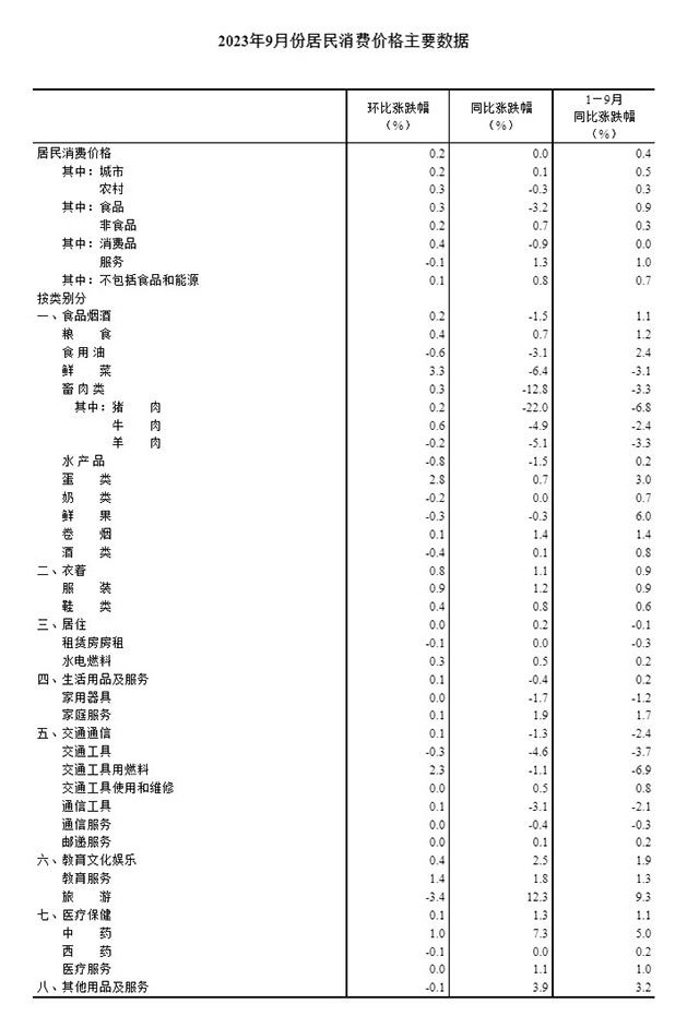 2023年9月份居民消費價格同比持平 環比上漲0.2%