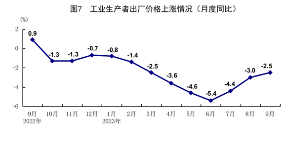 前三季度,全國工業生產者出廠價格同比下降3.1%。其中,9月份同比下降2.5%,降幅比上月收窄0.5個百分點,環比上漲0.4%。前三季度,工業生產者購進價格同比下降3.6%。其中,9月份同比下降3.6%,降幅比上月收窄1.0個百分點,環比上漲0.6%。