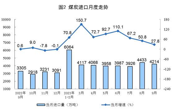 1—9月份,生產原煤34.4億噸,同比增長3.0%。進口煤炭3.5億噸,同比增長73.1%。
