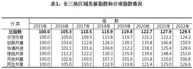 從測算結果看,以2015年為基期,2022年長三角區域發展指數為129.5,比上年提高1.6,與2015年相比,年均提高4.2。六個分領域指數均有所上升。其中,創新共建、綠色共保分項指數上升最快,年均提高超7.0;示范引領、協調共進和民生共享分項指數平穩提升,年均提高約4.0;開放共贏分項指數在波動中提高,年均提高1.0。
