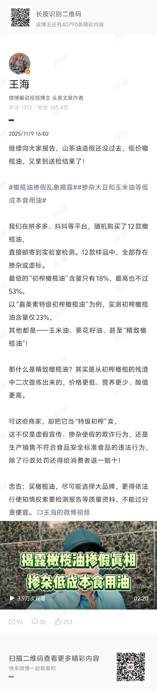 “打假人”王海發文質疑抖音等平臺存橄欖油參假亂象,平臺回應