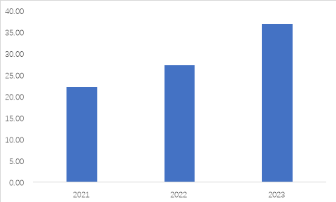全球藻源蝦青素的產量從2021年到2023年呈現逐年增長的趨勢,分別為22.20噸、27.20噸和36.98噸,這一上升趨勢反映了全球市場對蝦青素的強勁需求和行業產能的穩步提升。隨著技術的進步和市場的進一步開拓,預計藻源蝦青素的產量將繼續增長,滿足不斷上升的全球需求。