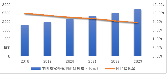 20世紀90年代初,膳食補充劑才正式進入中國市場,行業起步雖晚,但發展速度極快,經過僅僅20余年時間,到2014年市場規模已經突破千億大關,并且仍然維持著逐年增長的態勢。在2018年至2023年的6年間,我國膳食營養補充劑行業的市場規模歷經顯著擴張,從最初的1792.7億元人民幣激增至2711.2億元人民幣,年復合增長率為7.14%,展現出強勁的上升勢頭。在這段時間內,行業規模的年復合增長率達到了穩定的10.06%,反映了市場需求的持續旺盛以及行業整體的快速發展態勢。