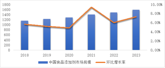 圖表 15 2018-2023年中國食品添加劑市場規模及增長情況(單位:億元)