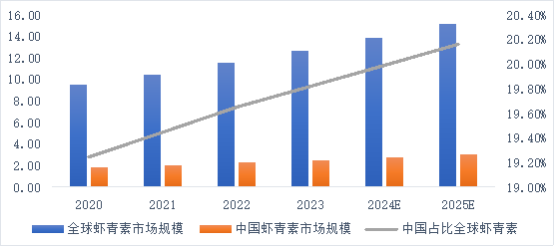 圖表 1 2020-2025年全球及中國蝦青素市場規模(單位:億元)