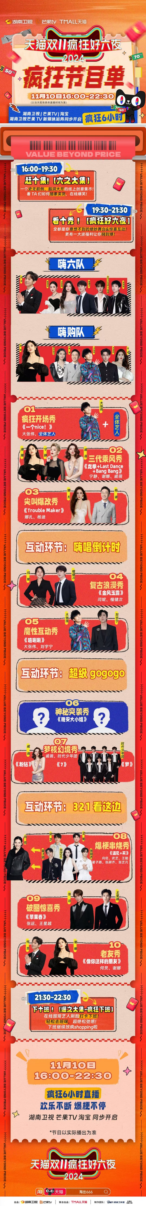 天貓深刻洞察到“發瘋文學”的本質是當代年輕人對自己情緒訴求的勇敢表達,其秉承著回饋用戶的初心,主動理解并走近年輕人。在今年的雙11,天貓選擇與引領青春文化和傳遞青春力量的湖南衛視周播趣味藝能綜藝秀《你好,星期六》“雙強聯手”,推出《天貓雙11瘋狂好六夜》,希望為廣大用戶建立一個娛樂與消費并存、新奇有趣至極的“沉浸式”體驗場,在這里,每個人都能盡情地自我表達,玩得暢快,買得滿足。