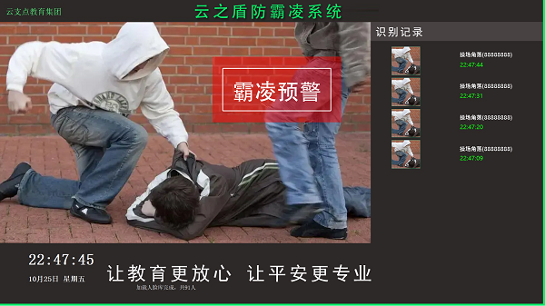 云之盾通過“敏感人員預警系統”、“校園霸凌行為監測系統”以及“中小學生情緒感知干預系統 ”三大系統,多措并舉,切實加強校園智能安防建設,努力構建校園智能安防安全長效機制,時刻繃緊校園安全防范之弦,把隱患消滅在萌芽狀態,促進校園防風險、保安全、護穩定政策的推行與落實。