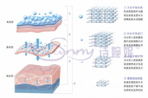 • 中分子HA:滲透至角質層,為肌膚提供深層滋潤,促進水分的傳遞。