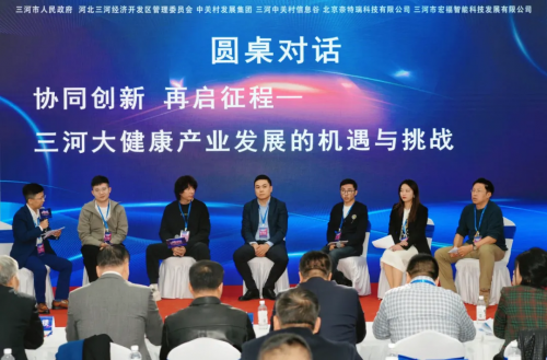 在圓桌對話環節,神州控股集團副總裁杜燚炘,北京奈特瑞科技有限公司董事長兼CEO曲毅,北京派特博恩生物技術開發集團有限公司總經理助理孫圣桐,北京攜力健康管理有限公司創始人張京雷,北京欽希生物科技有限公司CEO范世敬,國家公眾營養改善項目辦公室副秘書長許卓,頂呱呱科技股份有限公司北京分公司總經理江露琴,圍繞“協同創新 再啟征程——三河大健康產業發展的機遇與挑戰”展開對話,共同研討大健康產業賦能三河生態創新的發展機遇與前景挑戰。