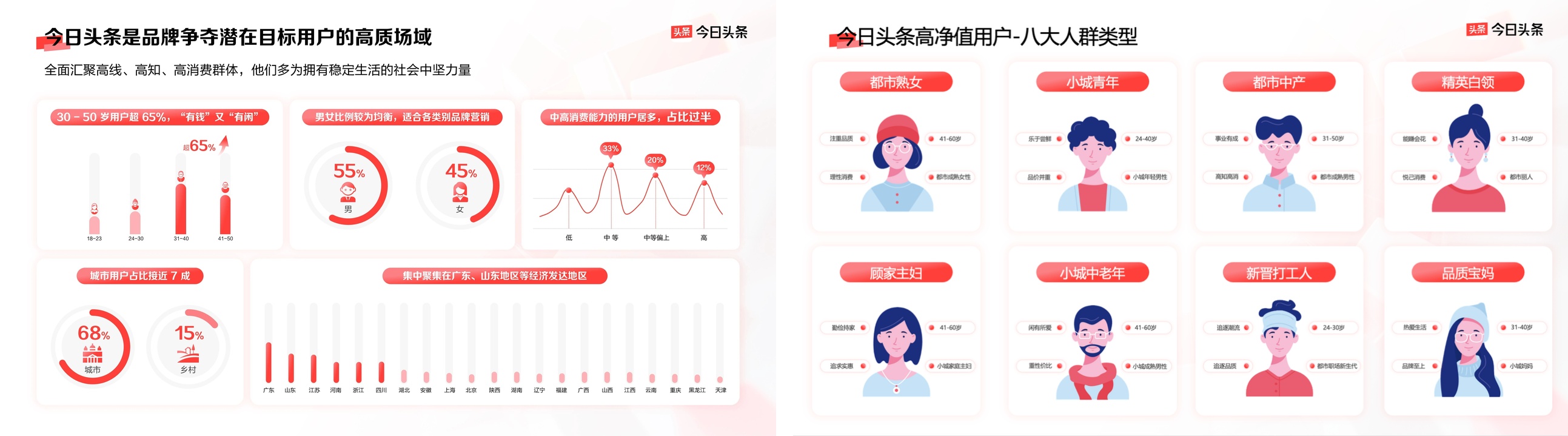 從《通案》中可以看到,今日頭條的高凈值人群活躍度更高、觸點更豐富,且平臺針對都市中產、新晉打工人、小城青年、小城中老年、精英白領、品質寶媽、都市熟女、顧家主婦八大人群類型,及其消費特征、內容關注,都有系統歸納,方便品牌精準觸達。