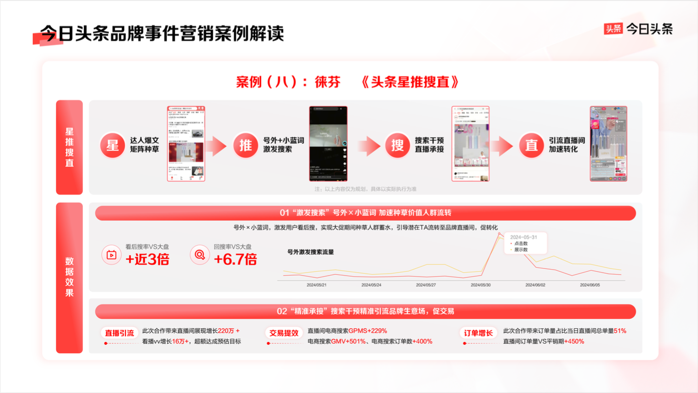 個護小家電品牌徠芬,在今日頭條巧用「頭條星推搜直」,打通達人爆文矩陣種草、號外+小藍詞激發搜索、搜索干預直播承接、引流直播間加速轉化全鏈路,在產品從種草到交易全過程中,構建出品牌專屬注意力真空場域。