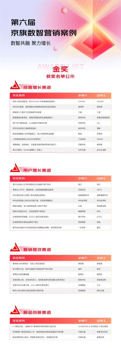 核心提示:12月17日,商家及合作伙伴翹首以待的“第六屆京旗數智案例大賽”獲獎名單正式出爐!58個案例基于京東DAAS,持續創新經營理念、不斷探索增長路徑,成為“數智共融,聚力增長”的新標桿。12月17日,商家及合作伙伴翹首以待的“第六屆京旗數智案例大賽”獲獎名單正式出爐!58個案例基于京東DAAS,持續創新經營理念、不斷探索增長路徑,成為“數智共融,聚力增長”的新標桿。 由京東數智業務聯合發起的京旗數智案例大賽,在今年京東11.11,來到了第六屆。第六屆京旗數智案例大賽,賽道全面升級升級,通過經營增長、用戶增長、營銷提效、新品創新四大場景,見證品牌及合作伙伴用數智化方式,在不確定性環境的挑戰下獲得確定性的增長。 在第六屆京旗數智案例大賽的獲獎案例中,有28個案例斬獲金獎,30個案例斬獲先鋒獎。具體名單如下: