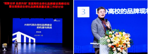 專家講座環(huán)節(jié),中國傳媒大學經(jīng)濟與管理學院副教授竇毓磊作了題為《AI時代民辦高校的機遇與挑戰(zhàn)》的主旨分享。他深入剖析了新時代工業(yè)革命三位一體結(jié)構(gòu)演化“人、組織、社會、數(shù)字化”模式,讓與會者對AI時代民辦高校全球化品牌建設(shè)有了更加清晰的認識與理解。他強調(diào),AI技術(shù)對教育模式的革新有重要作用,民辦高校應(yīng)利用AI技術(shù)優(yōu)化教學資源配置、提升教學效率,并在個性化學習、智能評估等方面探索創(chuàng)新路徑,鼓勵民辦高校積極把握時代脈搏,實現(xiàn)跨越式發(fā)展。