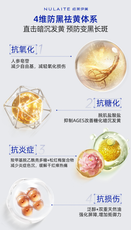 除了強大的淡斑功能,該精粹液還采用四抗體系 ——“抗糖、抗氧、抗炎、抗損傷”。 稀有人參皂苷作為超強抗氧劑,深入改善皮膚暗沉,精準抑制黑素細胞,實現靶向美白。同時,多重有效成分,如脫機鹽酸鹽、專利殼多糖、專利松紅梅復合物等,協同發揮超強煥膚作用,抵抗糖化,抑制炎癥,防御損傷,全方位抵御外界對肌膚的損傷,抑制斑點生成。