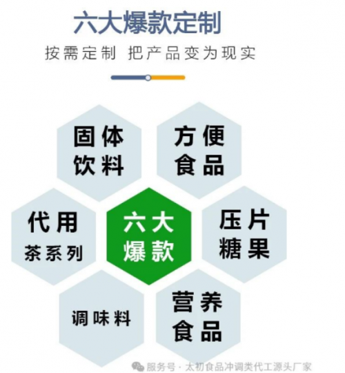 太初食品提供六大爆款定制,包括固體飲料、方便食品、代用茶系列、壓片糖果、調味料、營養食品等,滿足客戶多樣化的產品需求。