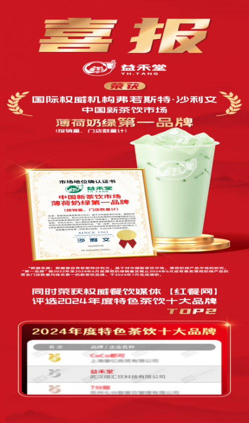 早在去年,益禾堂的薄荷奶綠就已成為繼益禾堂烤奶后的新爆款,上市至今累計銷售破億杯,連續5個月銷量top1,北方市場單品銷售占比近40%。其卓越的品質和口感贏得了市場的廣泛認可,并榮獲了沙利文認證機構授予的“中國茶飲市場薄荷奶綠第一品牌”稱號。沙利文作為全球知名的認證機構,其認證標準嚴格而權威,這一榮譽無疑是對益禾堂薄荷奶綠品質和口感的最好證明。
