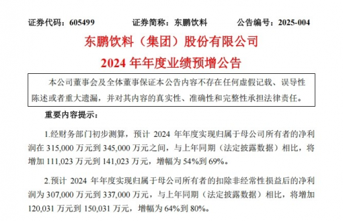 東鵬飲料2024年年度業(yè)績預(yù)增公告