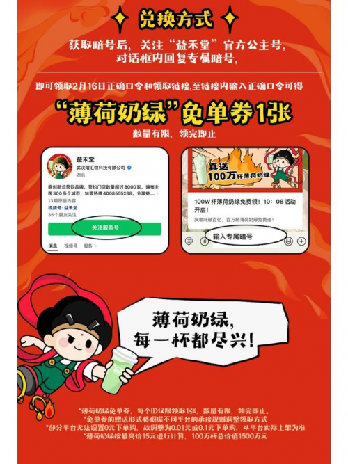 核心提示:2025年開年,茶飲界可謂非常“熱鬧”,其中最大的“顯眼包”非益禾堂莫屬。2025年開年,茶飲界可謂非常“熱鬧”,其中最大的“顯眼包”非益禾堂莫屬。從除夕夜薄荷奶綠意外爆紅,到元宵節喜提熱搜第五、借勢許出預祝《哪吒2》票房破百億送100萬杯薄荷奶綠的豪言壯語,再到情人節踐行承諾,微博、抖音、小紅書三大社交平臺狂送三天。