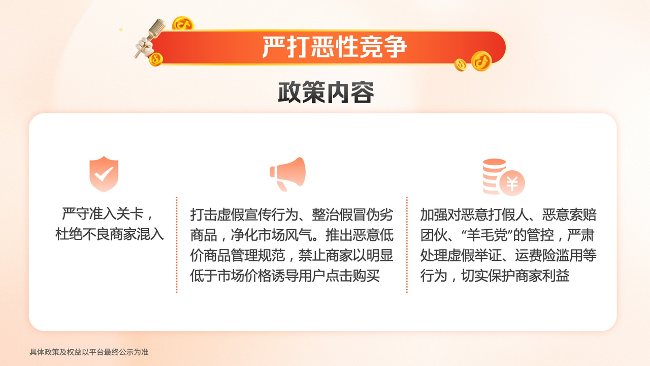為了優(yōu)化營商環(huán)境,抖音電商將嚴厲打擊惡性競爭,進一步加強平臺治理,以確保商家利益,確保平臺生態(tài)平穩(wěn)有序運行,具體措施包括嚴守準入關(guān)卡、打擊虛假宣傳、整治假冒偽劣商品、嚴肅處理虛假舉證等,并且加強管控惡意打假人、惡意索賠團伙及“羊毛黨”等。同時,對于惡意低價商品,抖音電商秉持不姑息原則,禁止商家以明顯低于市場價格誘導用戶點擊購買,構(gòu)建良性競爭環(huán)境。