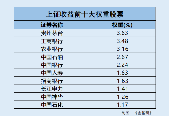 與上證指數一樣,上證收益的前十大樣本權重分別為貴州茅臺、工商銀行、農業銀行、中國石油、中國銀行、中國人壽、招商銀行、長江電力、中國神華、中國石化,權重分別為3.63%、3.48%、3.16%、2.67%、2.24%、1.63%、1.63%、1.41%、1.26%、1.17%。