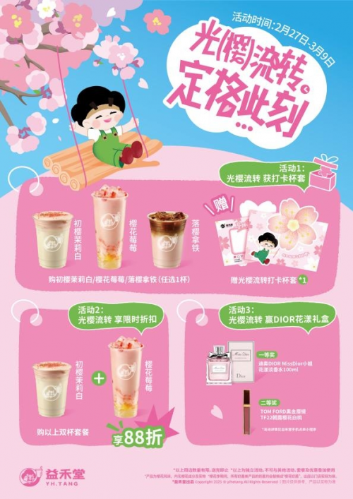 每逢春天,品牌都會推出櫻花元素產品,迎合春天的氛圍,利用粉色經濟吸引消費者。作為國民茶飲品牌益禾堂,每年的春日賞櫻季都有不一樣的玩法。今年是益禾堂櫻花系列第五年,主打「光櫻流轉 定格此刻」主題,以三款高顏值櫻花新品、創意互動玩法,打造春日消費新場景。2月27日至3月8日全國正式上線,以櫻花為紐帶,為消費者帶來一場春日限定浪漫!