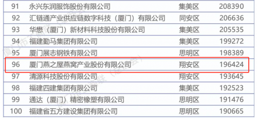 圖:燕之屋上榜2024廈門市民營企業100強榜單