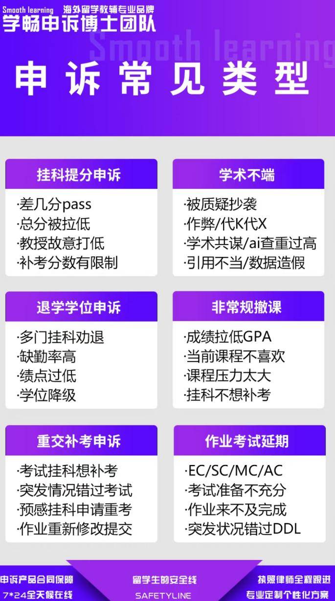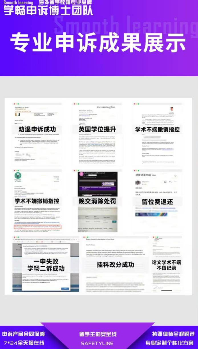 很多同學收到指控的時候一下子就六神無主,擔心自己的前途受到影響,無法獲得畢業證,幾十萬的學費打水漂,于是開始病急亂投醫,瘋狂找著申訴機構,看到無良中介各種迷魂湯灌下去,還打包票成功,直接馬上付錢。結果報價高不說,還沒申訴成功!還不退錢!要面對高昂的申訴費用!只有留學生才懂異國他鄉,屋漏偏逢連夜雨的滋味有多無助。因此,如果同學們不幸遇到了需要申訴的情況,請不要猶豫,立即聯系我們進行免費咨詢,我們7*24h在線,不用一個人在深夜偷偷emo,告訴我們你的情況,我們的服務以結果為導向,可以幫助你們省下不少冤枉錢!