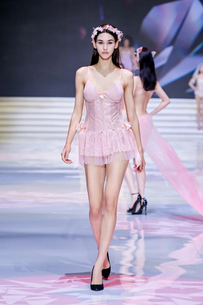 舞臺上的燈光變得柔和,水墨漸變的蕾絲與盤扣綁帶交織在一起,模特們手持折扇,身著靛藍與朱紅色的服飾緩緩而行。這一系列的設計靈感源自品牌對中國傳統文化的再詮釋,如“旗袍開衩連體衣”采用可撕拉網紗設計,呼應了“禁忌與解放”的主題。古典與現代的碰撞,含蓄與大膽的交融,讓觀眾沉浸在這場東方美學的欲望解構之中。