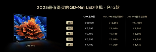 此外, TCL Q9L全系3個尺寸,85/75/65英寸,新品零售價分別為8999/6799/5499元,國補后僅需7199/5439/4399元。而TCL Q9L Pro全系更是提供了5個尺寸,98/85/75/65/55英寸,新品零售價16999/9999/7499/5999/4299元,國補后分別僅需14999/7999/5999/4799/3439元,重塑行業價值標桿。兩大系列新品覆蓋主流至高端市場,均為各自價位段的王炸產品,以極致質價比推動高端體驗回歸大眾消費本質,并進一步鞏固“買Mini LED就選TCL”的市場共識。