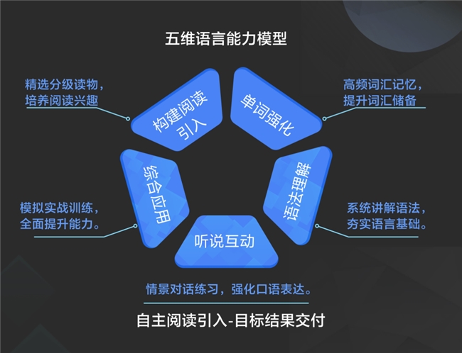 依托于公司在AI技術與認知科學方面的積累,未來慧學系統既可以獨立使用,也可幫老師們借助平臺系統,為用戶提供AI自適應學案與真人學伴有機結合的雙引擎架構服務。未來慧學為用戶構建閱讀引入-單詞強化-語法理解-聽說互動-綜合應用“五維語言能力模型",從自主閱讀引入到目標結果交付。