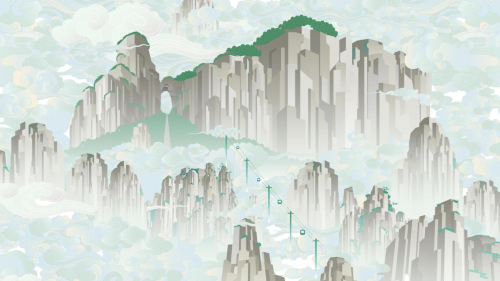 據城市文化設計師王成福介紹,張家界城市IP的核心理念是“山水仙境·煙火人間”。這不僅體現了張家界作為“人間仙境”的自然之美,也突出了其當地人的生活底蘊。王成福團隊圍繞這一主題,從視覺形象、文化故事、體驗方式等多方面入手,構建一個立體化、全方位的城市品牌形象。并選取最具代表性的自然景觀作為視覺符號——如張家界的奇峰、云海、森林、動物等元素。將這些自然景觀元素進行解構、提取、抽象等不同形式的藝術創作與表達,形成獨特鮮明的全新視覺體系,并用于公共藝術設置、城市視覺傳達、文旅周邊產品等全場景和全產業鏈應用。