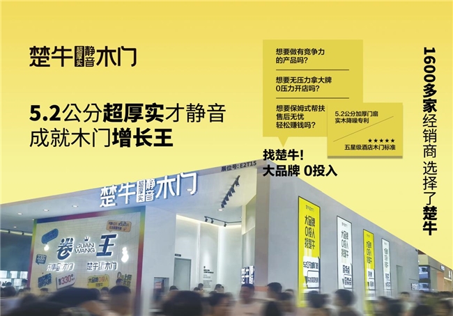 楚牛木門一個憑借5.2公分超厚實靜音木門與原創靜音專利、原創花色,成為近幾年木門行業脫穎而出的黑馬品牌,楚牛木門排名木門行業前十,已經穩固了楚牛在木門行業一線品牌的地位。
